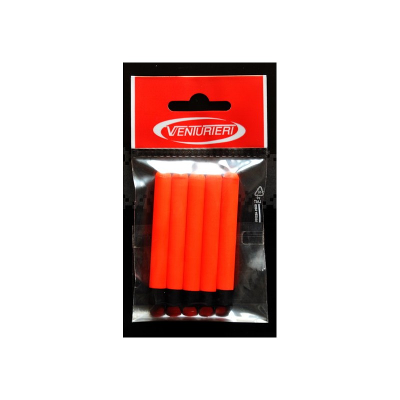 Antenne cave per galleggianti da pesca, la cavità all'interno permette alla luce di filtrare rendendole maggiormente visibili, diametro interno 7,5mm ed esterno 8mm per una lunghezza di 65mm,disponibili nei colori rosso e giallo fluorescente, in confezione da 5 pz.
